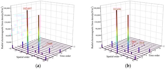 Figure 6 presents the two-dimensional Fourier decomposition results of radial electromagnetic force waves under both excitation schemes.