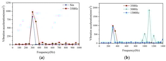 Vibration acceleration distribution of DFIM: (a) sinusoidal excitation current and 350 Hz switching frequency excitation current and (b) 350 Hz, 500 Hz, and 1300 Hz switching frequency excitation currents.