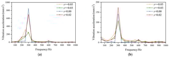 Figure 8 reveals significant variations in the vibration acceleration distribution of the DFIM across different rotational speeds, with supersynchronous operation exhibiting higher amplitudes than subsynchronous conditions. This increase results from electromagnetic forces induced by the interaction of winding phase-belt harmonic fields under supersynchronous speeds, which excite frequencies closer to the natural frequency of the breathing mode. Notably, although the electromagnetic force frequency at s = 0.02 lies even closer to the natural frequency, the resulting vibration amplitude remains lower than that under the s = 0.00 condition. This suggests that both the amplitude and frequency of electromagnetic force waves collectively govern core vibration, highlighting the multifactorial nature of vibration excitation. The results confirm that the vibration behavior of DFIMs in VSPS applications varies substantially over the operating range.