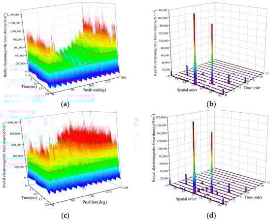 Figure 9 presents the radial electromagnetic forces and corresponding two-dimensional Fourier decomposition results under both static and dynamic eccentricity conditions at 30% eccentricity severity.