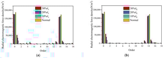 Harmonic distribution of radial electromagnetic force under different eccentricity ratios: (a) static eccentricity and (b) dynamic eccentricity.