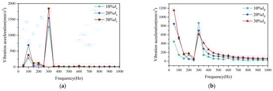 This study employs harmonic response analysis to investigate vibration characteristics in DFIM. The electromagnetic-structural coupling is implemented by applying radial electromagnetic force waves at stator tooth centers. Figure 7a compares the vibration acceleration spectra under different excitation methodologies. As shown in the figure, a prominent vibration peak occurs at 300 Hz, resulting from the proximity between the frequency of the 0th-order force wave (generated by interactions between 5th and 7th space harmonics of the stator and rotor) and the natural frequency (210 Hz) of the stator core’s breathing mode. Notably, the vibration amplitude under harmonic current excitation significantly exceeds that under pure sinusoidal excitation. Additionally, the harmonic-rich excitation induces a distinct vibration component at 350 Hz, attributed to the (0.7 fs) force produced by interactions between the harmonic-induced magnetic field and the fundamental magnetic field. These results conclusively demonstrate that harmonic components in the rotor excitation current amplify mechanical vibrations.