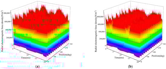 The vibration characteristics of DFIMs under rotor eccentricity conditions demonstrate significant correlation with both the fault type and the degree of eccentricity. This section presents a systematic investigation of radial electromagnetic forces and vibration responses for both static and dynamic eccentricity conditions across various eccentricity levels.