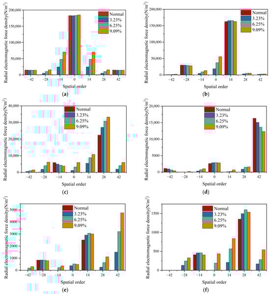 Harmonic spectra of electromagnetic force density in DFIM under different operating conditions: (a) 0 fs; (b) 2 fs; (c) 4 fs; (d) 6 fs; (e) 8 fs; and (f) 10 fs.