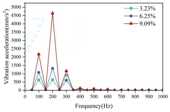 The vibration characteristics of the motor under different load imbalance levels were analyzed using harmonic response analysis, with the results shown in Figure 14. Compared with the vibration acceleration distribution under balanced load conditions, the motor exhibits pronounced low-frequency vibrations (e.g., at 100 Hz and 200 Hz) under load imbalance, with the amplitudes increasing proportionally to the degree of imbalance.