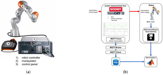 The system for which energy consumption is to be modeled is the seven-axis collaborative industrial robot LBR iiwa R800, developed by KUKA Germany GmbH, Augsburg, Germany. The main components of the robotic system are depicted in Figure 2a. The robot is integrated into a laboratory setup that simulates a production line, where it is employed for assembly and handling tasks. Robot applications and motion programming are developed using the KUKA Sunrise.Workbenchdevelopment environment. Within this environment, the KUKA RoboticsAPI is available, offering functionalities for motion planning, execution, and data recording.