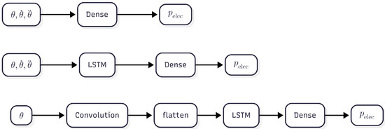 Three different distinct model architectures were developed, namely dense models, LSTM models, and LSTM models with convolutional layers, as can be seen in Figure 6. Both the dense and LSTM models can take a variable amount of input features. One network has only the normalized seven axis angles as input, the second additionally has the normalized angular velocities as input, which leads to a 14-dimensional input, and the third network has all 21 constructed features as input.
