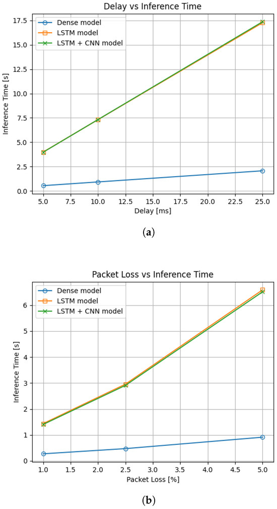 Effects of network complications on inference time: (a) effect of added network delay; (b) effect of added packet loss. Note that both models using LSTM layer have almost identical inference times under these conditions and are therefore overlapping in the graphs.