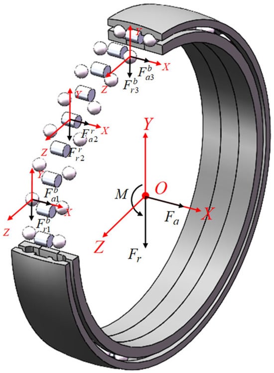 To analyze ball–column composite bearings under the external load, a global and local coordinate system is established with the center of each column bearing and the relative displacement of the inner ring with respect to the collar center as the origin (Figure 2). Let represent the external total load on the bearing’s inner circle, and denote the external load acting on the inner ring of each column bearing load.