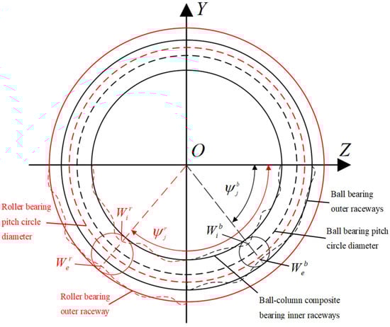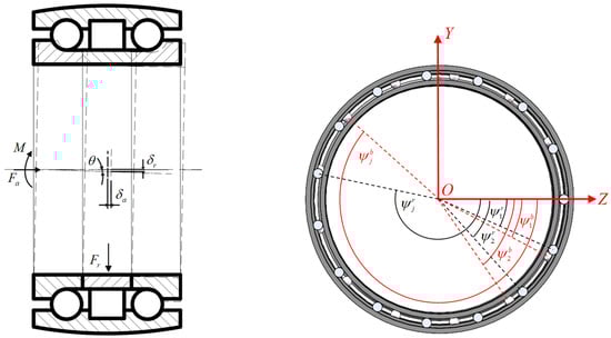In this context, raceway deformation analysis is presented only for the XOY plane; however, deformation in other planes can also be analyzed in the same manner. When subjected to radial force Fr, axial force Fa, and tilting moment M under loaded conditions, the ball–column composite bearing-loaded conditions experience deformation in its three columns of the rolling body, influenced by their positional relationship, as shown in Figure 3. indicates that the relative radial displacement of the inner and outer rings after the bearing is loaded; indicates that the relative axial displacement of the inner and outer rings after the bearing is loaded; and shows that the tilting angle of the inner ring after the bearing is loaded. j and represent the number and azimuthal angle of each rolling element.