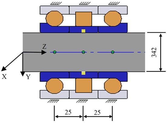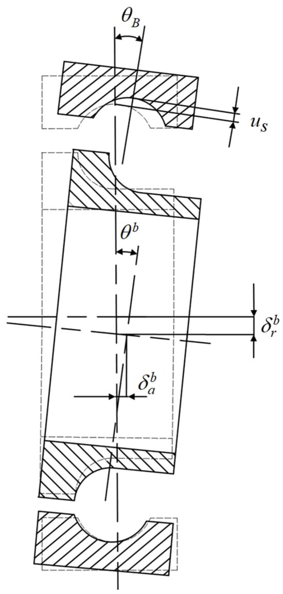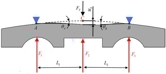 In Equations (4)–(6), , , and represent the external load extension in the normal direction to the outer ring of the three raceways of the force. and represent the columns of the bearing center cross-section of the relative distance. denotes the seat of the reaction force. denotes contact deformation of the outer ring generated by the external load extension in the normal direction. x denotes the lateral position coordinate of the beam, used to describe the distance from the calculation point to the reference origin. E represents the elastic modulus of the bearing material and I corresponds to the cross-sectional moment of inertia