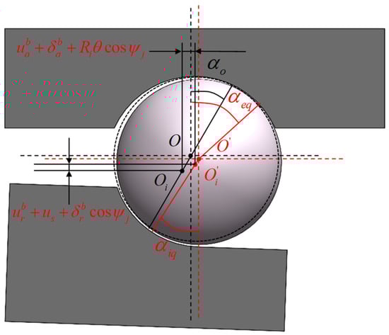 Figure 6 and Figure 7 depict the relative displacement between the inner and outer rings of an angular contact ball bearing under combined loading, along with the relative positions of the jth ball center and the raceway curvature centers of inner and outer rings. The bearing raceways remain unloaded with no external load. Owing to the arcuate structure of the outer ring, its contact area with the housing is limited. Under heavy combined loading, deformation occurs in the thin-walled outer ring, leading to a change in its position. Specifically, the outer ring undergoes an angular displacement and a radial displacement , altering the position of its raceway curvature center. Simultaneously, the inner ring experiences an angular displacement , radial displacement , and axial displacement in the loading direction, shifting its raceway curvature center from position to . Consequently, the ball center moves from position to and the contact angles between the ball and inner and outer raceways change from the initial preload angles to and after loading.