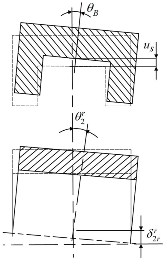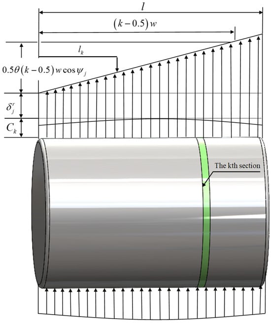 As shown in Figure 8, the roller column bearings influenced by the ball bearings experience complex load behavior due to the deflection angle of the bearing collar. To address this, the “slicing method” is analyzed and calculated on the cylindrical roller load. As shown in Figure 9, the joint load cylindrical roller column roller and raceway contact deformation consists of two aspects: (1) deformation produced by the jth roller under external load and (2) reduction of the convexity of the extended roller bus profile on the kth slicing unit . The figure details the components of the elastic deformation of the rollers, where the profile protrusion’s amount is negatively deformed for the kth slicing unit. This unit remains in the no-contact state until the deformation produced counteracts the gap between the rollers and the raceway.