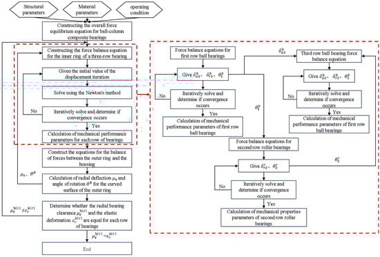 The numerical solution methodology proposed in this study, which accounts for the raceway deformation effects, follows the computational workflow as illustrated in Figure 10. First, the global force equilibrium equations for the ball-roller compound bearing system are established to determine load distributions on each bearing row’s inner ring under external loading. Subsequently, based on the axial load direction, three-dimensional force and moment equilibrium equations are sequentially formulated for each bearing row, iteratively transferring displacement variables from preceding rows downstream. A cyclic solution algorithm is implemented until convergence. Finally, outer ring deformation (radial displacement and tilt angle) is computed via the raceway-to-housing force equilibrium using the obtained contact loads, followed by feedback iterations to update the three-row bearing equilibrium system.