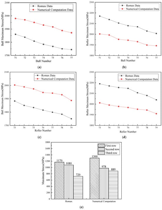 Comparison of calculation results. (a) Impact of the number of balls on maximum contact stress of the ball bearings under Condition 1. (b) Impact of the number of balls on maximum contact stress of the roller bearing under Condition 1. (c) Impact of roller quantity on maximum contact stress of the ball bearings under Condition 1. (d) Impact of roller quantity on maximum contact stress of the ball bearings under Condition 1. (e) Condition 2, 78 rollers, 74 balls, and contact angle of 40°.