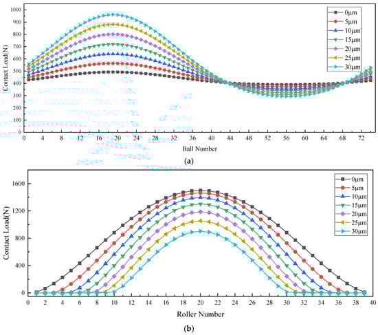 The analysis reveals that with a ball race radial clearance of approximately 10 μm and roller race clearance of 20 μm, the hybrid bearing system exhibits distinct load-sharing characteristics across operating conditions. Under light loads, angular contact ball bearings predominantly support external loads. As radial loading increases, sufficient elastic deformation eliminates the roller bearing clearance, enabling load sharing. Under heavily loaded conditions, the system automatically transfers approximately 70–90% of the radial load to the roller column, leveraging its superior radial stiffness and linear contact stress distribution. Simultaneously, the ball bearings transition to supporting residual axial loads with minimal radial contributions. This mode utilizes the angular contact ball bearings’ high rigidity and low friction to maintain rotational accuracy while preventing roller column skidding damage from partial unloading effects under boundary lubrication, consequently improving transmission efficiency. However, excessive radial clearance can compromise performance. It may induce ball race radial runout and potentially trigger dynamic roller impacts during sudden load shifts, as inertial effects or step loading could cause momentary rolling element collisions, ultimately degrading the overall rotational precision of the hybrid bearing.