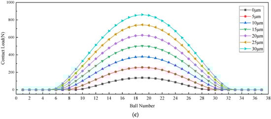 Impact of circular surface radial deflection of outer ring on load distribution in multiple bearing rows loaded zones. (a) Load distribution in the loaded zone of a first-row angular contact ball bearing. (b) Load distribution in the loaded zone of a second-row angular contact roller bearing. (c) Load distribution in the loaded zone of a third-row angular contact ball bearing.