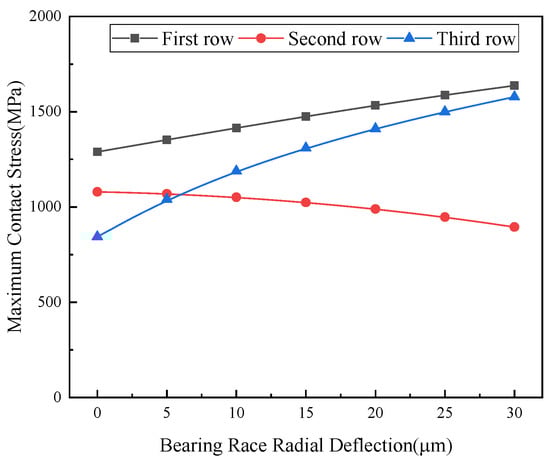 Impact of outer ring raceway radial deflection on maximum contact stress in multi-row bearings.