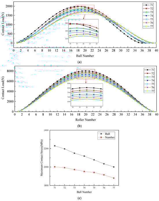 Impact of ball quantity on mechanical performance in multi-row bearings. (a) Impact of ball quantity on load distribution in the loaded zone of angular contact ball bearings. (b) Impact of ball quantity on load distribution in the loaded zone of cylindrical roller bearings. (c) Impact of ball quantity on maximum contact stress of each row of bearings.