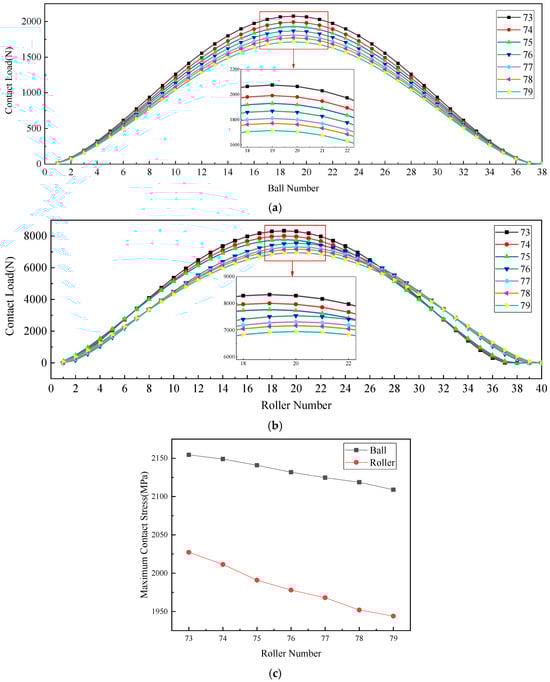 Figure 15 illustrates the influence of angular contact ball quantity on load distribution and maximum contact stress under Condition 1, which included 78 cylindrical rollers and 0 axial and radial clearances. As the number of balls increases, the radial load of the ball bearing row increases. when the number of loaded balls increases from 35 to 39, the load zone increases and reducing the maximum contact load per ball decreases. The enhanced load-carrying capacity of the ball bearing row simultaneously decreases the external load and maximum contact load. This balanced load redistribution improves the stress distribution uniformity, leading to a reduction in the maximum contact stress for all bearing rows as the ball count increases.