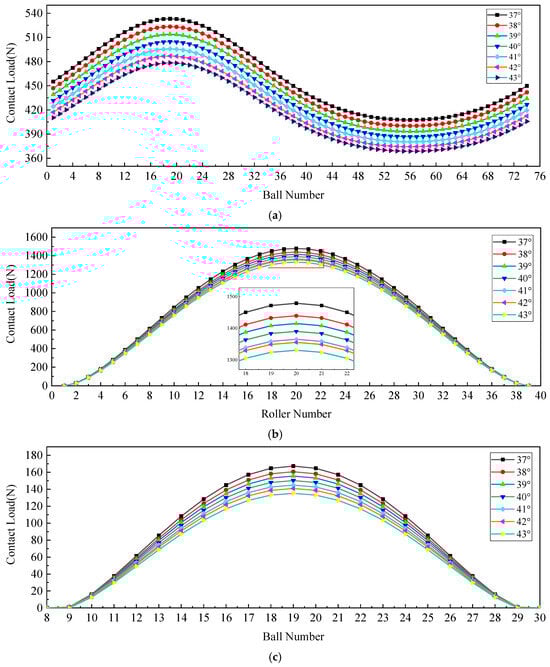Figure 17 shows the effect of the ball contact angle on load distribution and maximum contact stress across bearing rows under Condition 2, with 74 balls, 78 rollers, and 0 axial and radial clearance. Increasing the contact angle reduces the radial load carried by both ball bearing rows: The first row shows a decreasing radial force and resultant load reduction, whereas the third row exhibits a diminished load zone and reduced maximum contact load owing to its lower radial load share. This load redistribution increases the external force applied to the roller bearing row, thereby elevating both the maximum roller contact load and corresponding contact stress. Conversely, the maximum contact stress of the balls progressively decreases with increasing contact angle. The results demonstrate the critical role of contact angle selection in balancing multi-row bearing load sharing and stress optimization under zero-clearance preload conditions.