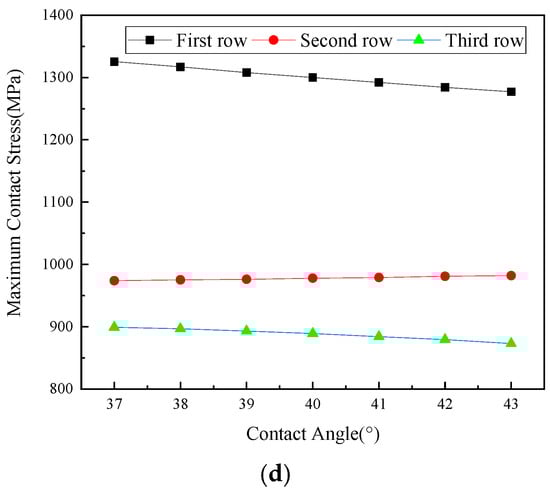 Impact of contact angle on mechanical performance in multi-row bearings. (a) Impact of contact angle on load distribution in the bearing region of first-row ball bearings. (b) Impact of contact angle on load distribution in the bearing region of second-row roller bearings. (c) Impact of contact angle on load distribution in the bearing region of third-row ball bearings. (d) Impact of contact angle on the maximum contact stress of each row of bearings.
