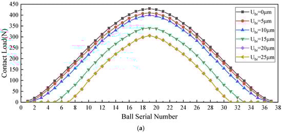 Adjusting the of roller race radial clearance while maintaining a constant ball race radial clearance significantly modifies the load distribution and contact stress characteristics in hybrid bearings, as illustrated in Figure 19. The findings demonstrate that an increased roller race clearance markedly reduces the number of loaded rolling elements in the roller column, consequently diminishing its load-bearing capacity. This geometric variation, analyzed using Hertzian contact theory, produces a coupled decrease in both the peak contact load and the resultant stress within the roller assembly. Concurrently, the load redistribution mechanism shifts a greater portion of the external loading to the ball column, inducing proportional increases in both the quantity of stressed ball elements and their corresponding maximum contact loads. This load transfer generates substantially elevated contact stresses within the ball raceway, potentially affecting the overall bearing performance characteristics.
