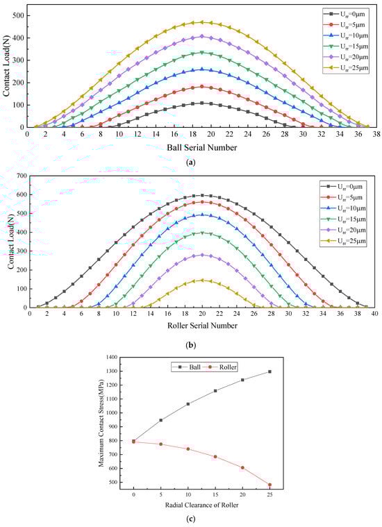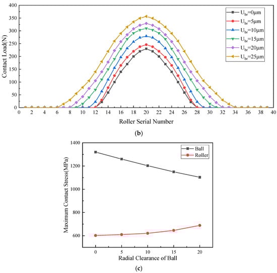 Impact of radial clearance of ball row on mechanical properties of each row bearing. (a) Impact of radial clearance of ball rows on load distribution within the loaded zone of ball bearings. (b) Impact of radial clearance of ball rows on load distribution within the loaded zone of roller bearings. (c) Impact of radial clearance of ball rows on maximum contact stress of each row bearing.