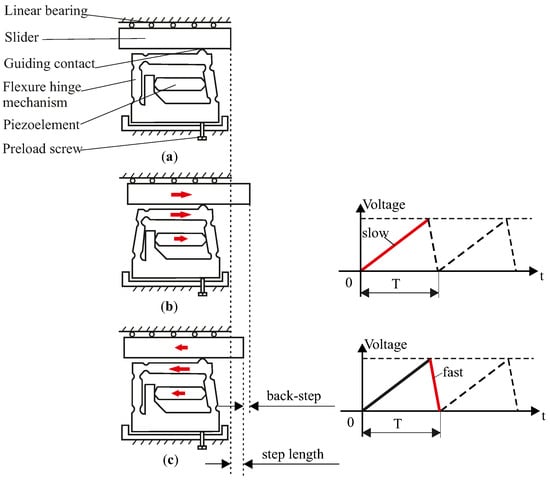 Structural design and operational principle of the stick–slip actuator [18]: (a) Initial configuration, (b) Stick phase under slow expansion of the piezoelectric stack, and (c) Slip phase during rapid contraction.