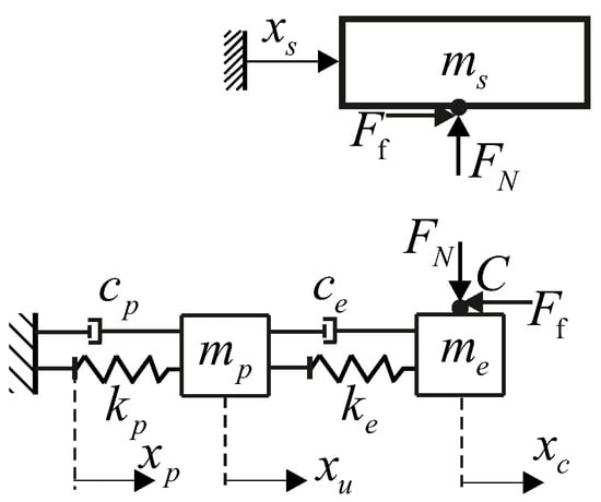 Following the MSD approach, the prototype developed by Sun et al. is modeled as a system of interconnected mass–spring–damper components. As illustrated in Figure 3, the piezoelectric actuator is modeled using parameters , , and , representing its effective mass, stiffness, and damping coefficient, respectively. Similarly, the four-bar flexure hinge mechanism is modeled with equivalent mass , stiffness , and damping . The input to the actuator is a sawtooth voltage signal, represented by . The displacement of the actuator and the contact point C are denoted by and , respectively, while the slider displacement is expressed as . The slider, with mass , moves under the influence of the friction force , which is evaluated based on the set of Equations (19)–(23). The equations of motion for the piezoelectric actuator and the flexure hinge mechanism are derived using Newtonian mechanics and presented in Equations (25) and (26), respectively.