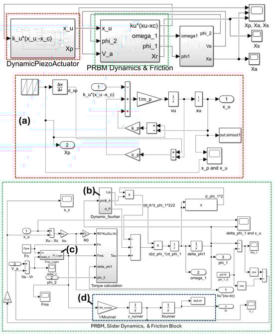 MATLAB/Simulink block diagram of the proposed dynamic model. The system consists of four main subsystems: (a) the piezoelectric input block, which generates the sawtooth displacement excitation; (b) the flexure compliance block, implementing the PRBM-based four-bar mechanism via the Lagrangian formulation; (c) the LuGre friction block, which models stick–slip transitions at the contact interface; and (d) the load mass block, representing the slider dynamics. The outputs include the piezo stack displacement (), flexure point displacement (), and slider displacement/velocity (), from which frequency–velocity response characteristics are computed.