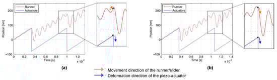 To characterize and visualize this phenomenon, dynamic simulations were performed at two representative frequencies, 1.5 kHz and 1.405 kHz, as shown in Figure 5. At each frequency, both the displacement trajectories of the slider and the piezoelectric element, which depend on the time, are shown. In both cases of simulated frequency, residual micro-vibrations from the preceding cycle significantly influenced the starting condition of the subsequent cycle, thereby altering the net step length of the slider. The relative phase shift between the slider and the piezo-element was found to either augment or diminish the displacement per cycle, depending on their direction of motion. Specifically, Figure 5a illustrates a case where opposing motions lead to a reduction in step length, while Figure 5b shows a scenario in which aligned motions cause an increase.