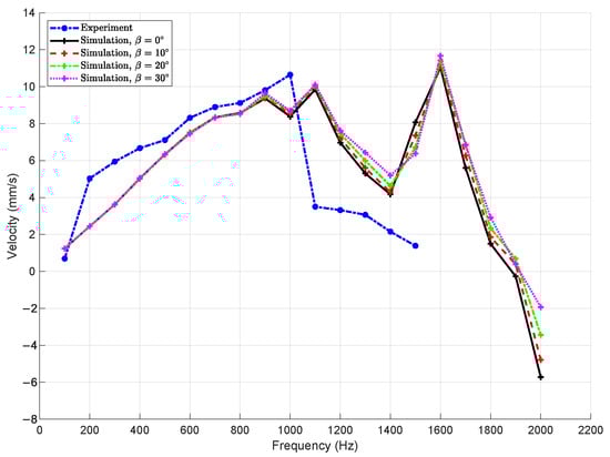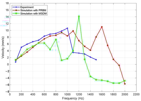 The measured and simulated slider velocities as functions of the driving frequency are presented in Figure 6. In the experimental setup, the driving frequency was varied from 100 Hz to 1500 Hz in increments of 100 Hz. For the simulations, the frequency range was extended from 100 Hz to 2000 Hz using the same step resolution. The simulation results obtained using both the proposed PRBM and the MSDM are plotted alongside the experimental data for comparison. While validation is performed up to 1.5 kHz, simulations are extended to 2 kHz to illustrate the extrapolation capability of the model for potential future actuator designs. It is emphasized that results beyond 1.5 kHz are predictive in nature and not experimentally validated.