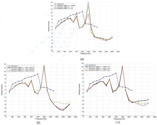 Comparison between experimental results and numerical simulations for different model parameters using the MSDM at a preload of 20 N: (a) Effect of equivalent moving mass on slider velocity; (b) Effect of stiffness coefficient on slider velocity; (c) Effect of damping coefficient on slider velocity. Experimental data extracted from [18].