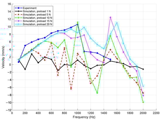 Comparison of slider velocity as a function of driving frequency between experimental results [18] and numerical simulations using the PRBM and MSDM at a preload of 20 N.