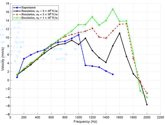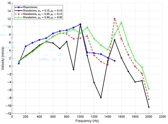 In contrast, simulations performed with higher stiffness values, and , show significantly improved dynamic performance. The slider velocity remains stable and consistent across a broad frequency range up to 900 Hz, with pronounced resonance peaks observed near 1100–1300 Hz that closely match the experimental data. Among the tested values, yields the best agreement with experimental results, both in terms of amplitude and resonance location. The case with , while still stable, tends to overestimate velocity amplitudes and introduces secondary resonances not observed in the measurements.