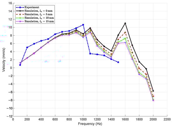 The influence of the position of the contact point between the slider and the contact element attached to the four-bar mechanism—denoted by the parameter —is evaluated and presented in Figure 13. In the simulations, is varied from 0 mm to 15 mm in increments of 5 mm. The results indicate that changes in have negligible impact on the slider’s velocity within the linear frequency range, particularly for excitation frequencies below 900 Hz. In this region, the velocity–frequency curves for all values of closely overlap, suggesting that the position of the contact point does not significantly affect the dynamic behavior of the system. At higher frequencies beyond 900 Hz, minor discrepancies begin to emerge among the curves. These variations may be attributed to changes in the effective moment arm introduced by altering the contact point position, which could slightly affect the force transmission and energy dissipation during dynamic interaction. Nevertheless, the overall influence remains limited compared to other design parameters, such as the joint stiffness or preload. This outcome reinforces the strength of the PRBM modeling framework, which allows detailed investigation of geometric parameters like . Such analysis is not feasible with lumped-parameter models (e.g., MSD models), which abstract away structural geometry. Hence, the PRBM approach proves advantageous in evaluating the sensitivity of actuator performance to specific design features and supports design-oriented simulation analysis aligned with the objective of this study.