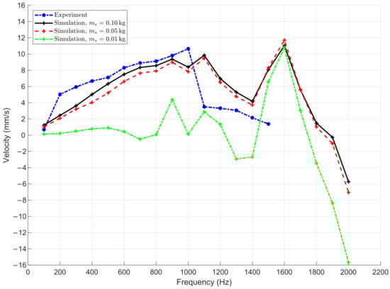 In contrast, with higher slider masses ( and ), the system maintains more stable performance with higher velocities, particularly in the range from 600–1800 Hz. The curves for these two masses closely match the experimental data, indicating that above a certain threshold, the influence of mass becomes negligible.