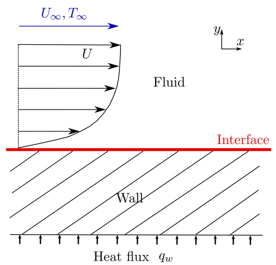 The problem studied is illustrated in Figure 2. The flat plate is submitted to a heat supply . The objective is to estimate the temperature at the interface , at any position along the flat plate, in the stream direction. The application of KPM is thoroughly described by Lachi et al. [11], and the method is used in the same way in the present paper. By approximating the velocity and the temperature by polynomials, the energy equation in the Navier–Stokes equations can be solved: