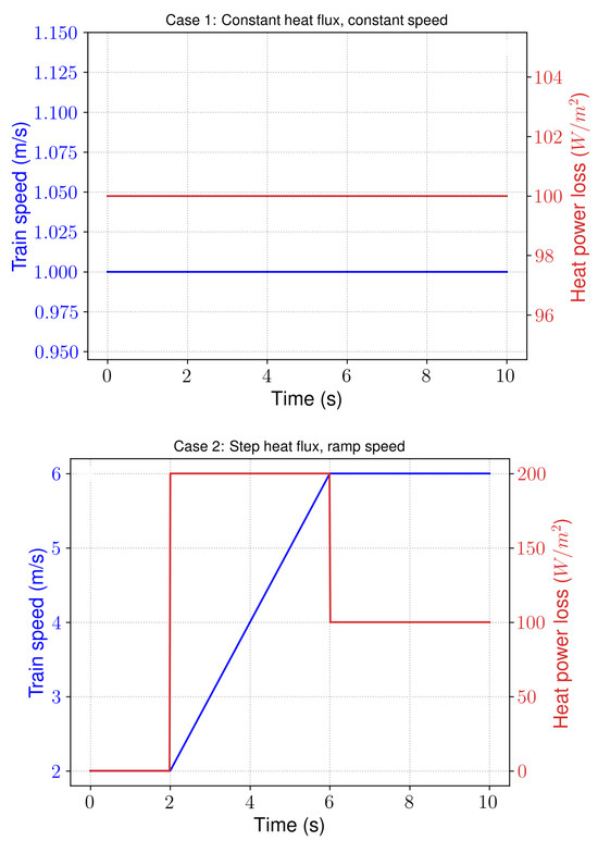- Case 1: A simplification of a driving behavior during cruise when the speed and the traction power are constant. It is here assumed that the train undergoes almost no elevation and that the flow conditions are favorable (no crosswind or very unsteady wind). The temperature represents the static temperature in the freestream in the surroundings of the train. is the train speed, and is the temperature of the wall, heated by , the heating power dissipated. Its calculation is estimated in the next section. Case 1 aims at first validating Lachi’s method, based on Karman–Pohlhausen’s method, in comparison to CFD. Second, the values of the thermal resistance and the response time are stored in a correspondence table, depending on the speed and the power loss.