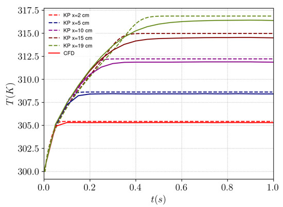 Temperature evolution over time for case 1 at five different axial positions of the plate. Comparison between CFD (solid lines) and Karman–Pohlhausen’s method (dashed lines).