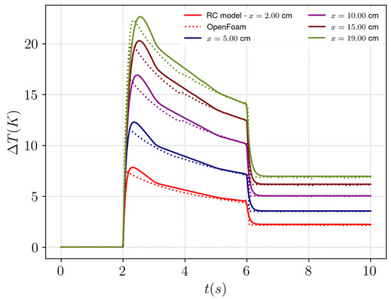 Temperature difference evolution over time for case 2 at five different axial positions of the plate. Comparison between RC model (solid lines) and CFD (dashed lines).