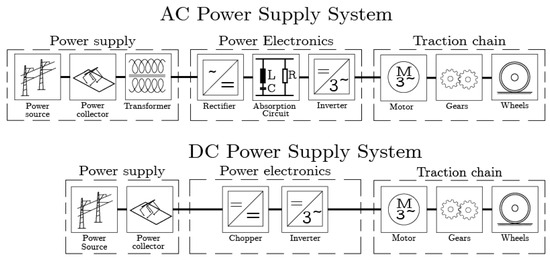 Typical representation of a traction chain of a rail vehicle with an AC supply system and a DC supply system.