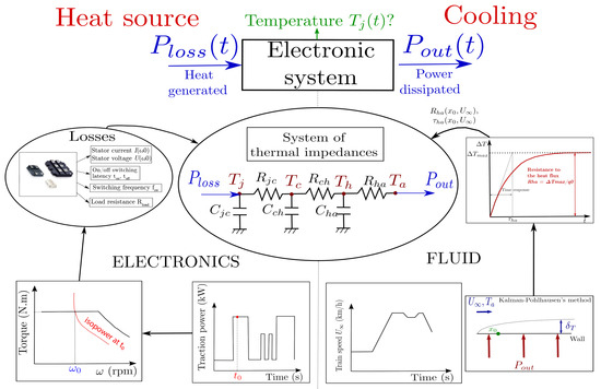 The sketch is broken down into two parts, summarizing how both electronic and fluid models work. Using the traction power and the train speed as inputs, the power generated and the power dissipated can be used as inputs for the thermal RC network showed in the middle of the sketch. Thus, the temperature can be estimated over time at the different nodes, corresponding to the different locations of interest in between the control board and the heat sink.