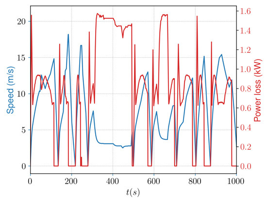 The power loss and speed over time are plotted in Figure 10 in the first 1000 s of the drive cycle. It can be noticed that the acceleration phases lead to a large increase in the losses because the motor power needed for the traction force increases the thermal losses in the power electronics. Also, it should be mentioned that the phases of speed reduction here correspond to a large elevation that the train has to withstand to maintain sufficient speed. Again, the electric motor requires more power, and the conversion system losses are thus increased. This is due to the increased torque, subsequently leading to an increase in the current and voltage amplitudes. This shows how the power loss in the inverter is heavily influenced by the operational conditions of the train such as running resistance and acceleration; thus, its trend does not directly follow the trend in train speed. The power loss represents about % of the average traction power, corresponding to realistic values observed on metro trains [20].