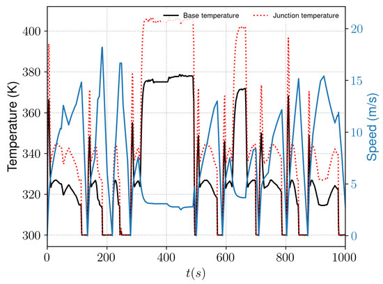 Figure 11 shows the temperature increase at two different positions of the flat plate, modeling the interaction between the bottom of the IGBT and the air. The variations are important, related to the variations of thermal losses and speed, shown before. In particular, when the speed decreases and the losses are high between 300 s and 500 s, the surge in temperature is significant, approximately 70 K at the more downstream position. At the same time, the air resistance increases abruptly with the decrease in speed and when the losses are largest: the heat loss is not as well dissipated and the temperature subsequently increases.