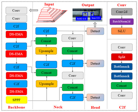 DSEW-YOLOv8 is derived from the YOLOv8n network, improved by using depthwise separable convolutions to optimize the EMA mechanism, forming the DS-EMA module, which is applied to the backbone network to enhance small-target detection capabilities. Additionally, the WIoU (Weighted IoU) loss function replaces the original CIoU loss function and is applied to the backbone, neck, and head networks, improving the model’s detection accuracy in complex environments and ensuring the precision and robustness of elevator safety-keeper bolt loosening detection. The improved DSEW-YOLO network structure is shown in Figure 1.