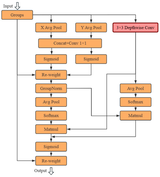 It is evident that depthwise separable convolution dramatically reduces the number of parameters relative to a standard convolution, thereby improving computational efficiency. Consequently, in the EMA mechanism, we replace the 3 × 3 convolutions with depthwise separable convolutions, which markedly lower computation and parameter counts while retaining EMA’s original multi-scale, cross-spatial attention aggregation advantages. The architecture of the improved DS-EMA module is shown in Figure 3.