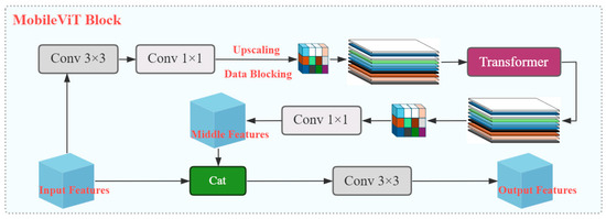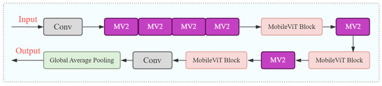 MobileViT is a lightweight yet powerful feature extractor that fuses MobileNet convolutions with a vision Transformer, reducing parameters while still capturing global context. As illustrated in Figure 5, the architecture comprises three parts: an initial convolutional stem, a core MobileViT-Block stack, and a final output head. The stem reduces spatial resolution and increases channel depth by standard convolution and down-sampling, enabling subsequent blocks to extract features more efficiently.