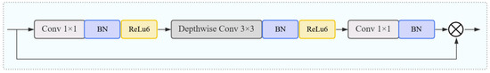 In addition, MobileViT employs an MV2 inverted-residual block: a 1 × 1 expansion, a depthwise-separable convolution for high-dimensional processing, and a 1 × 1 projection that fuses features and forms a residual link to the input (Figure 7). This design increases non-linear capacity while lowering computation, satisfying both lightweight and performance requirements.